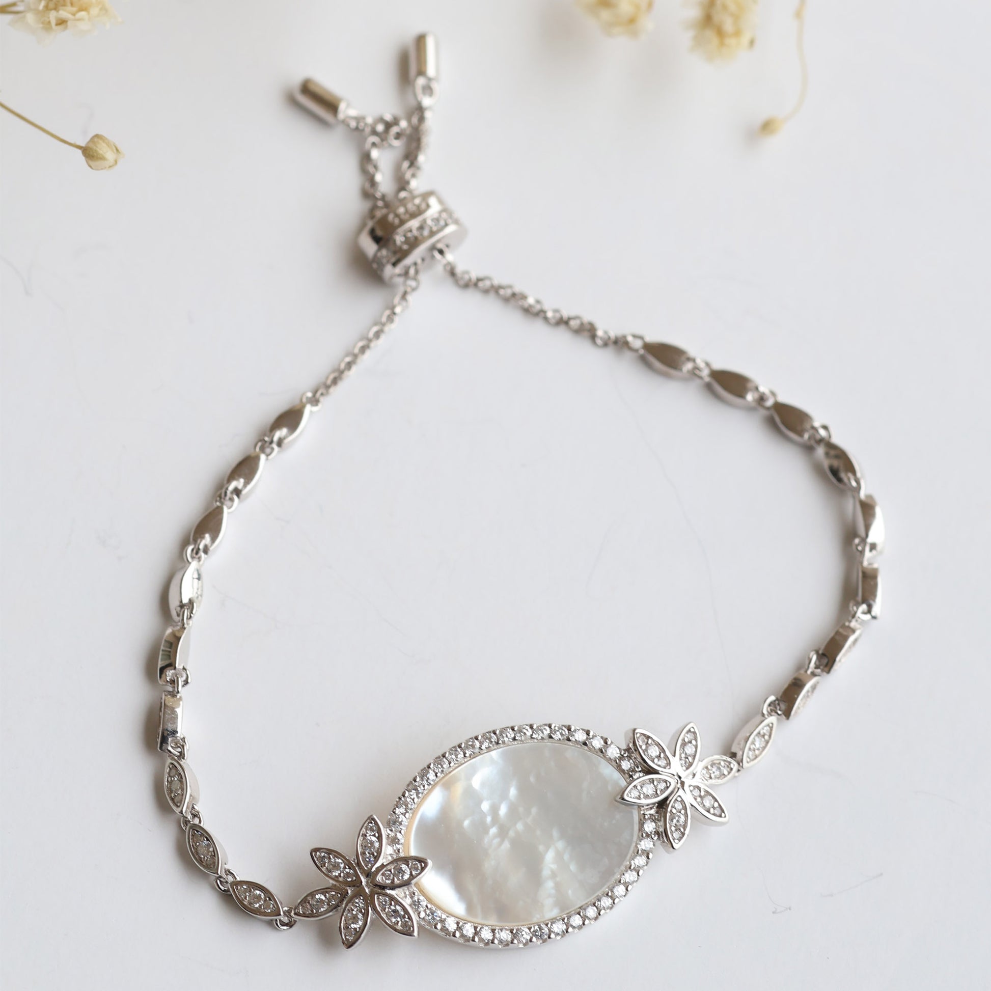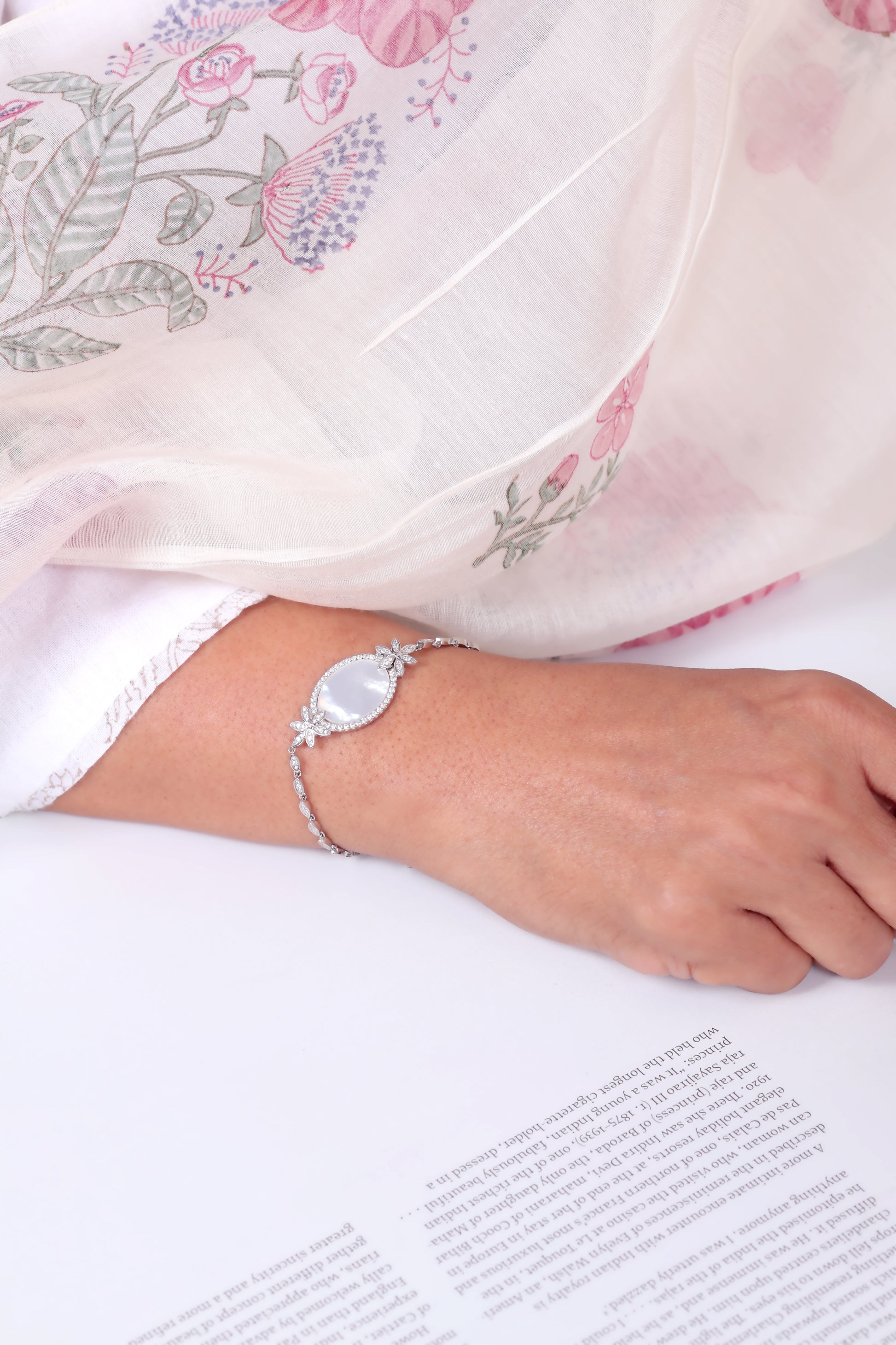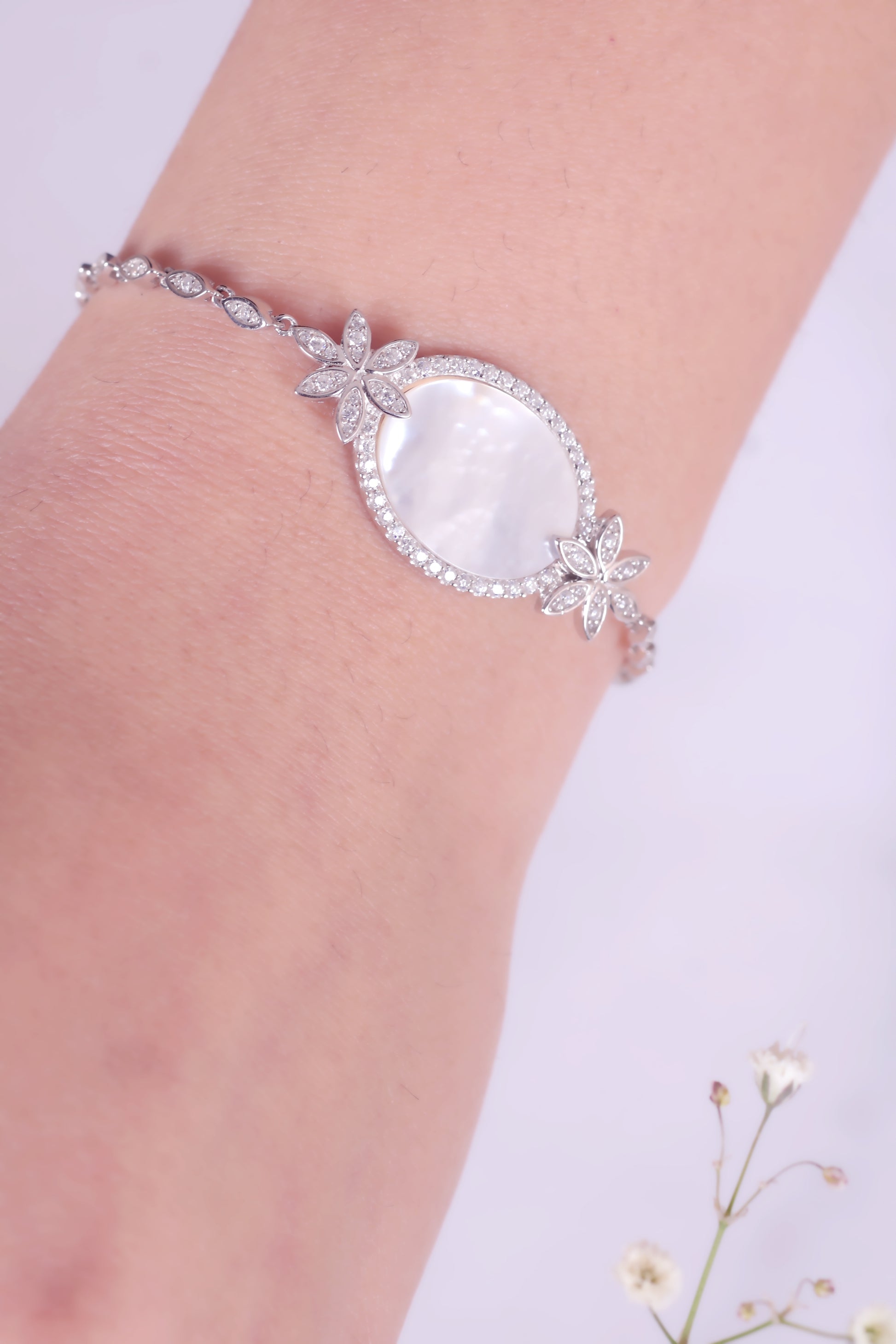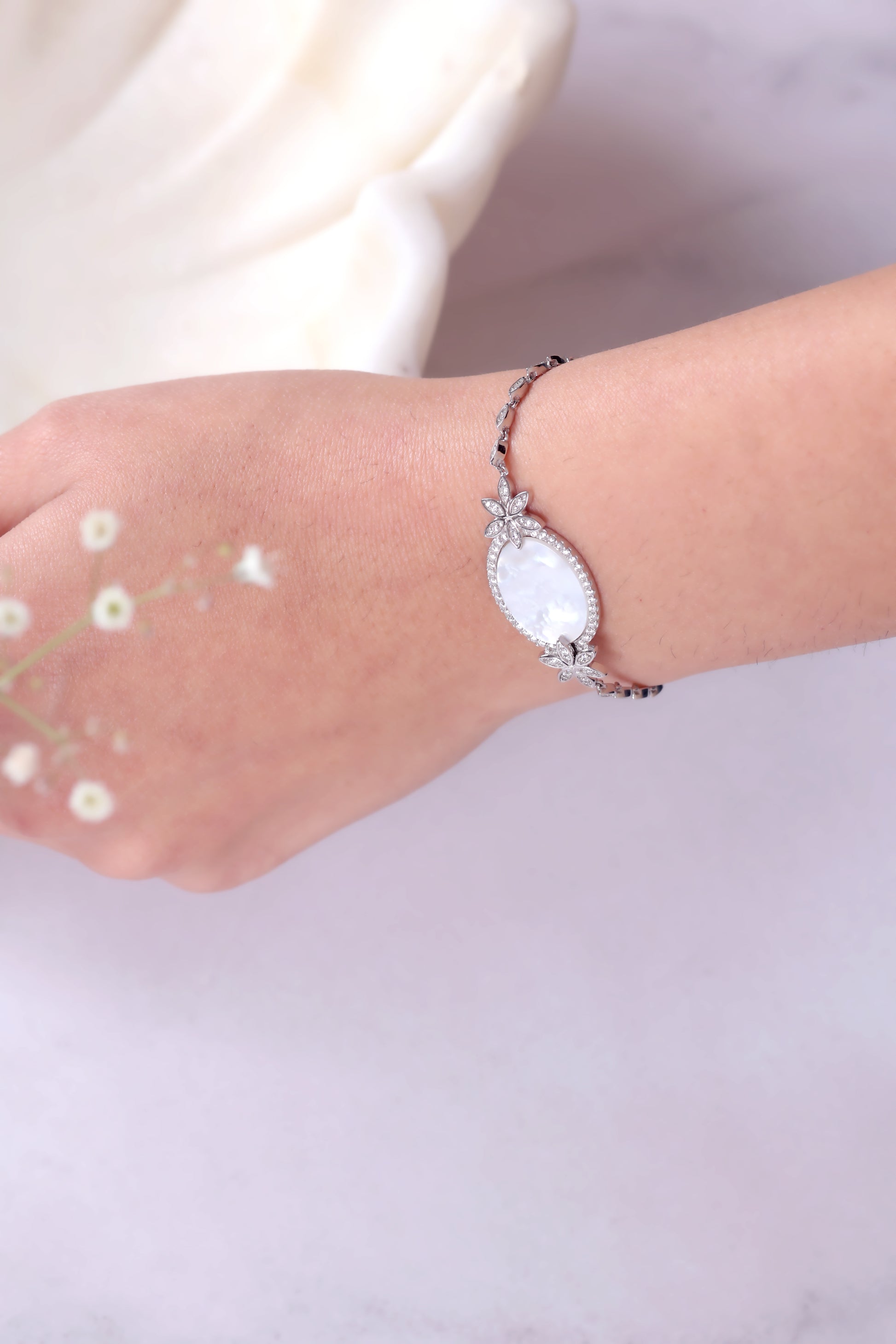 Each mother-of-pearl gem is lovingly set within a sterling silver bracelet, creating a harmonious blend of sophistication and natural radiance.
