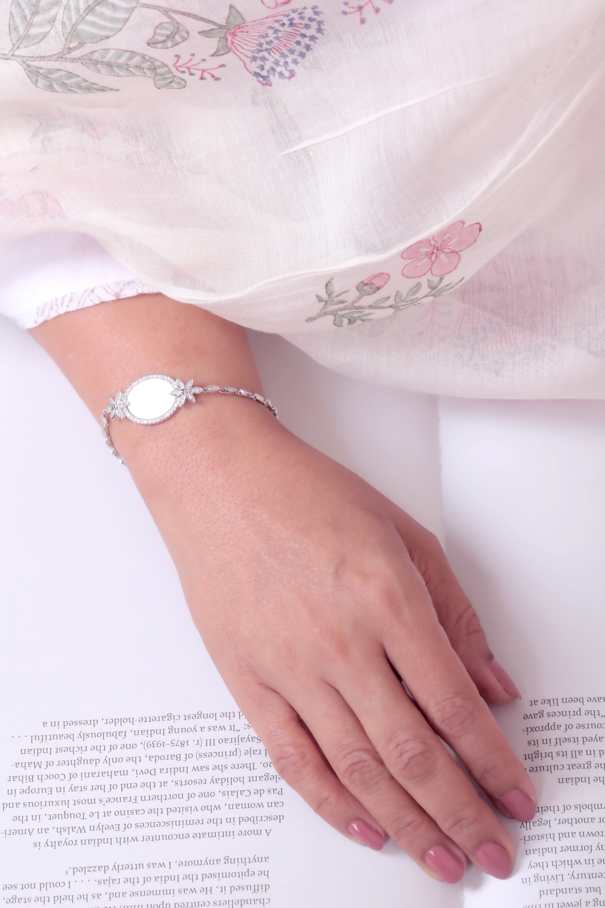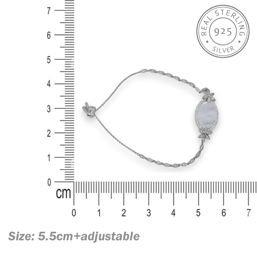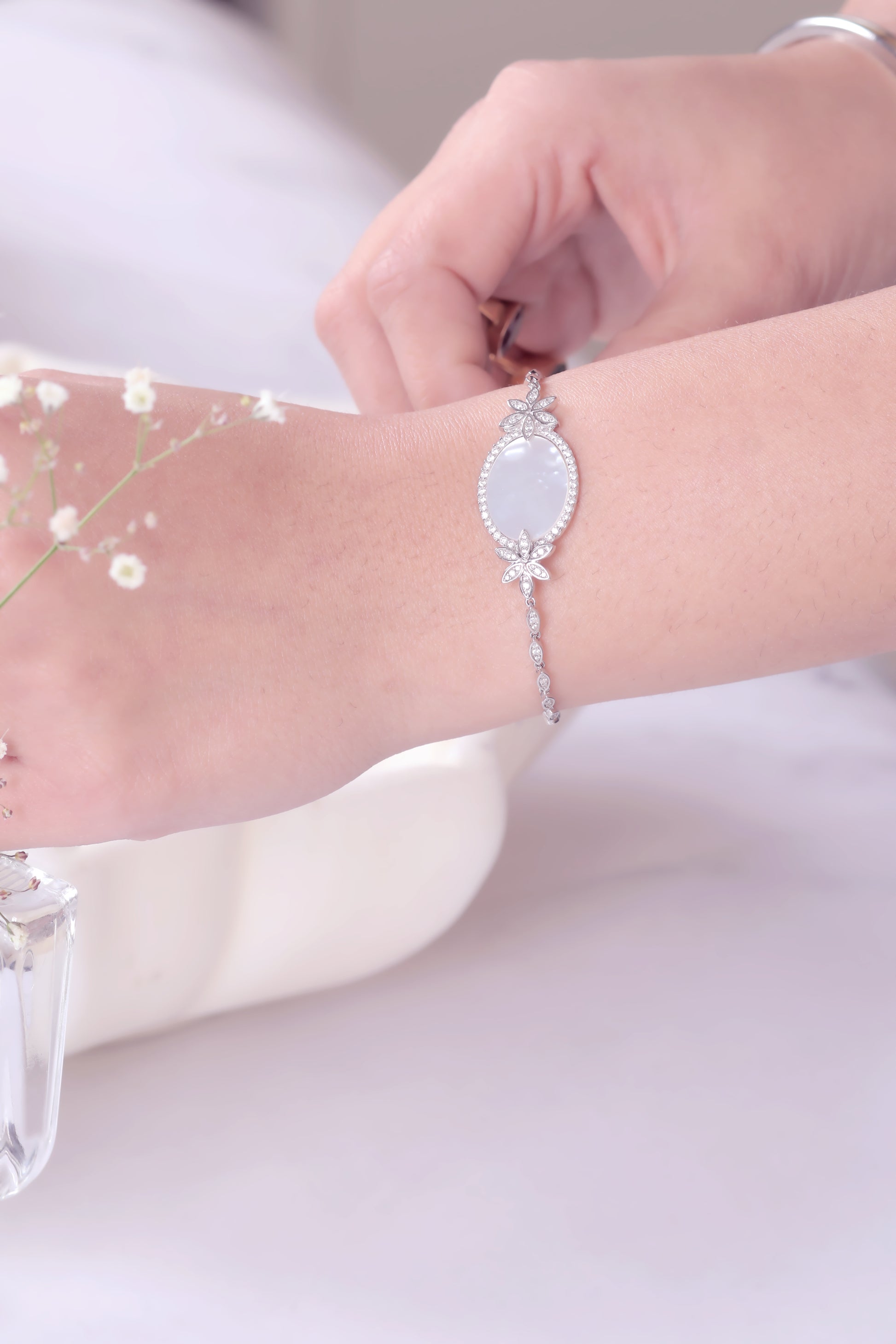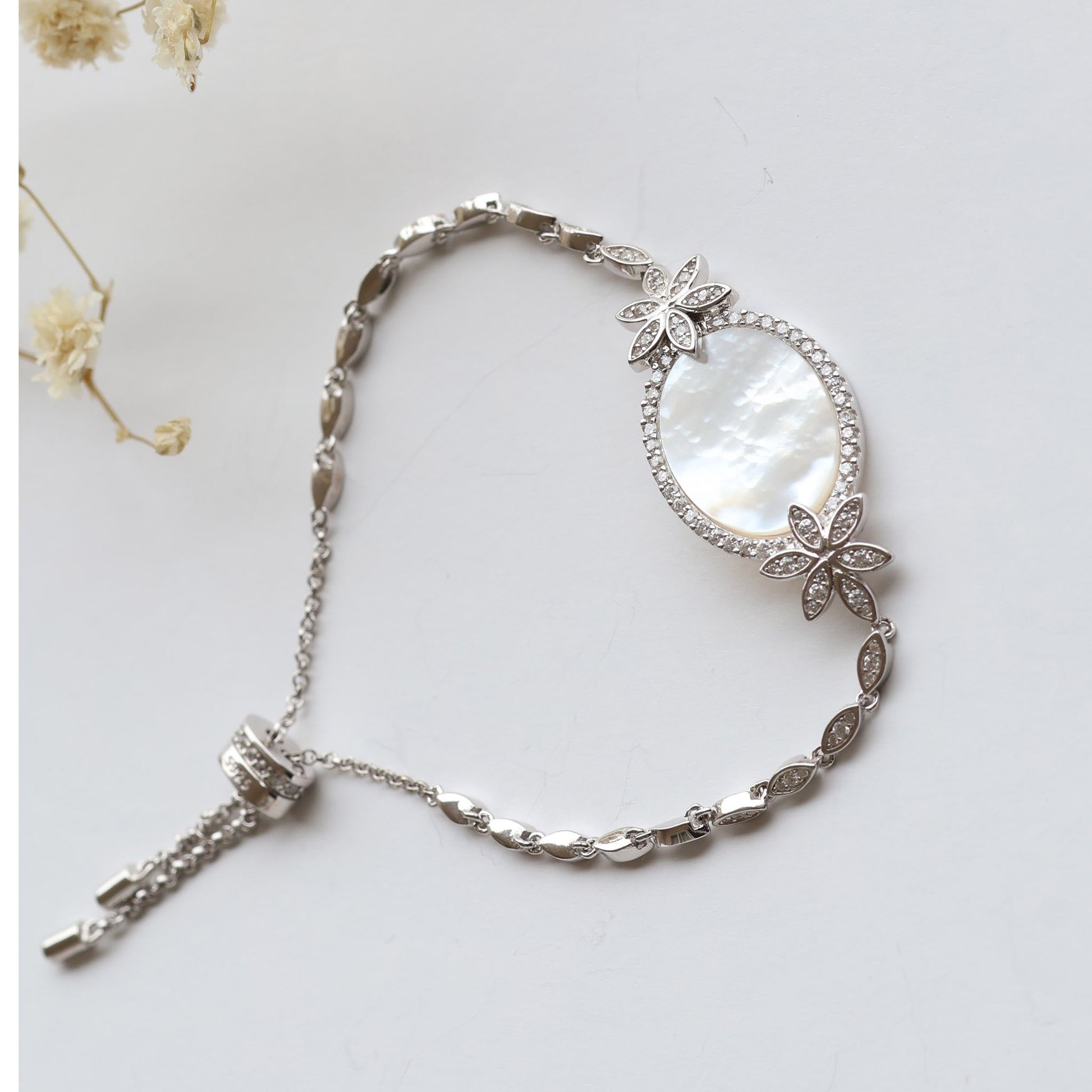 Each mother-of-pearl gem is lovingly set within a sterling silver bracelet, creating a harmonious blend of sophistication and natural radiance.